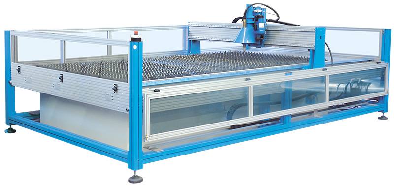Low-cost compact Plasma Cutter System, including cutting table, premium plasma source, catch tray, and ready for connection of a smoke exhaust