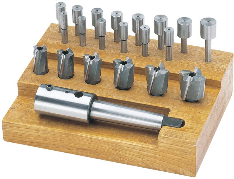 Knuth Kombi-Flachsenker-SatzMehrschneidiger Senker mit stirnseitiger Bohrung. Durch auswechselbare Führungszapfen ist ein Senker für mehrere Vorbohrungen unterschiedlicher Größen zu verwenden.