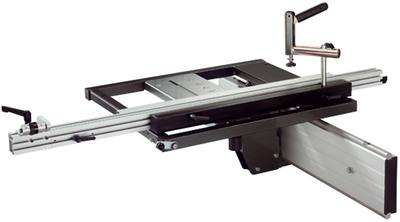 Sliding table carriage run on ball bearings, 600 x 650 mm, with precision angle fence, adjustable by 45°, fence rail 1,100 mm for extension of fence length to 2,000 mm, guide rail 1,000 mm.