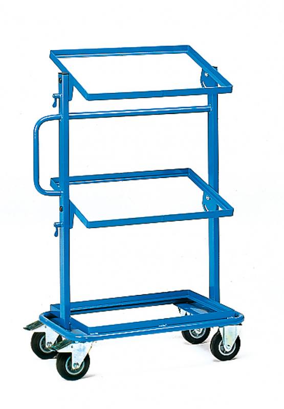 mit offenem Rahmen und neigbaren Ladeflächen Stahlrohr- und Profilstahl-Konstruktion, pulverbeschichtet, blau RAL 5007. 2 Lenk- und 2 Bockrollen, Naben mit Rollenlager, Feststeller an den Lenkrollen, gemäß der Europäischen Norm EN 1757-3. Obere und mittlere Ladefläche nach beiden Seiten um 15° und 30° neigbar, Arretierung mittels Federriegel. Gesamtlänge: 820 mm, Gesamtbreite: 450 mm. Tragkraft obere und mittlere Ladefläche 50 kg. |