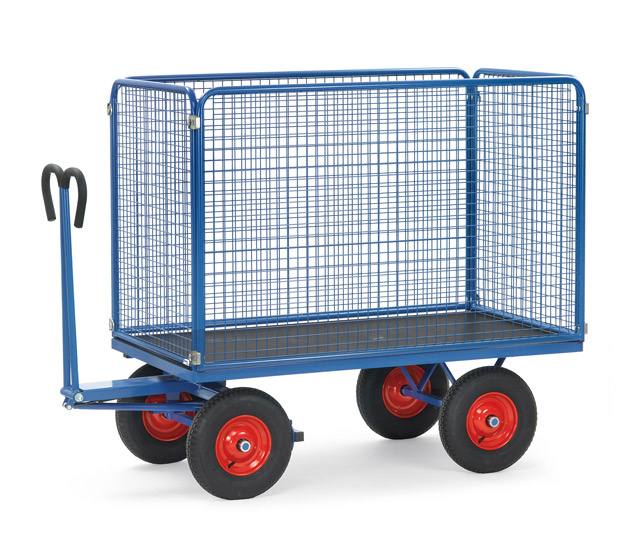 | Modular system: Made of welded sectional steel, powder coated blue RAL 5007. Surface durably protected, resistant to impact and scratches, 4 tubular sleeves at corners. Boogie steered by crown gear, scissors-shaped shaft with safety handle with soft rubber grip and with an automatic damped retraction in resting position. Platform of anti-slipping, waterproof plywood. Wheels optionally with solid rubber or pneumatic tyres, hubs with roller bearings. With automatic braking system effective on the front wheels according to the European Standard EN 1757-3. Boards 1000 mm high, sides screwed on platform, Sides mountable and removable. Tubular steel frame with welded wire lattice 40 x 40 x 4 mm, powder coated blue RAL 5007. |