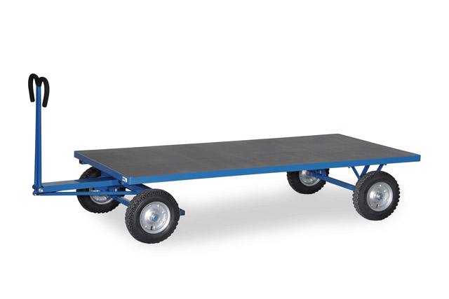 | Modular system: Made of welded sectional steel, powder-coated blue RAL 5007. Surface durably protected, resistant to impact and scratches, 4 tubular sleeves at corners. Boogie steered by crown gear, scissors-shaped shaft with safety handle with soft rubber grip and with an automatic damped retraction in resting position. Platform of anti-slipping, waterproof plywood. Wheels optionally with solid rubber or pneumatic tyres, hubs with roller bearings. With automatic braking system effective on the front wheels according to the European Standard EN 1757-3. | ||||||||||||