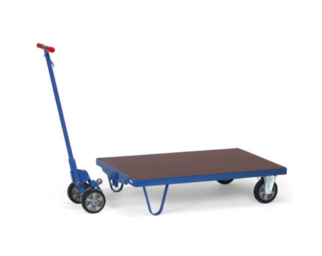 | Profilstahl geschweißt, 2 Stützböcke, Kugelpfanne mit Sicherheitsverriegelung, pulverbeschichtet blau RAL 5007. Ladefläche aus wasserfestem Sperrholz. 2 Bockrollen, Naben mit Kugellager. Aufbauten wie Stirn- und Längswände möglich. | ||||||||||||