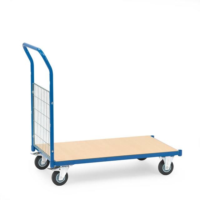 ends made of wire lattice Tubular steel, welded construction, powder-coated, RAL blue 5007. Platform made of derived timber material board, beech decor surface. 2 castor wheels and 2 fixed wheels, solid rubber tyres, hubs with roller bearings. Castors with wheel locks, according to the European Standard EN 1757-3 (safety of platform trolleys). Ends and sides made of wire lattice 100 x 50 x 2,8 mm. Height of end: 500 mm. |
