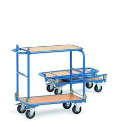 Stahlrohr-Konstruktion, pulverbeschichtet, mit Holzwerkstoffplatten, Oberfläche Buchendekor. 2 Schiebebügel, zusätzlich mit klappbarer Tischplattform aus Stahlrohr, Ladefläche Holzwerkstoffplatte. 2 Lenk- und 2 Bockrollen, Vollgummi-Bereifung, Naben mit Rollenlager. Feststeller an den Lenkrollen, gemäß der Europäischen Norm EN 1757-3.