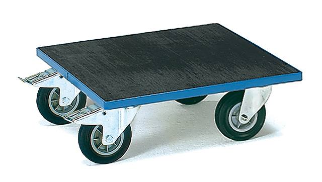 Aus Winkelstahl, mit Holz-Plattform mit Riefengummi, geschweißt, pulverbeschichtet blau RAL 5007, Holzplattform mit Riefengummi bespannt, 4 Lenkrollen mit Vollgummi-Bereifung, Naben mit Rollenlager. 2 Stück mit Feststeller, gemäß der Europäischen Norm EN 1757-3.