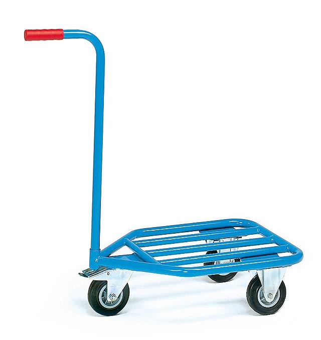 | Made of tubular steel welded and powdercoated, blue RAL 5007, with tubular steel platform, handles bolted on, 1 castor wheel and 2 fixed wheels, solid rubber tyres, hubs with roller bearings. Castor with wheel locks, according to the European Standard EN 1757-3 (safety of platform trolleys). | ||||||||||||