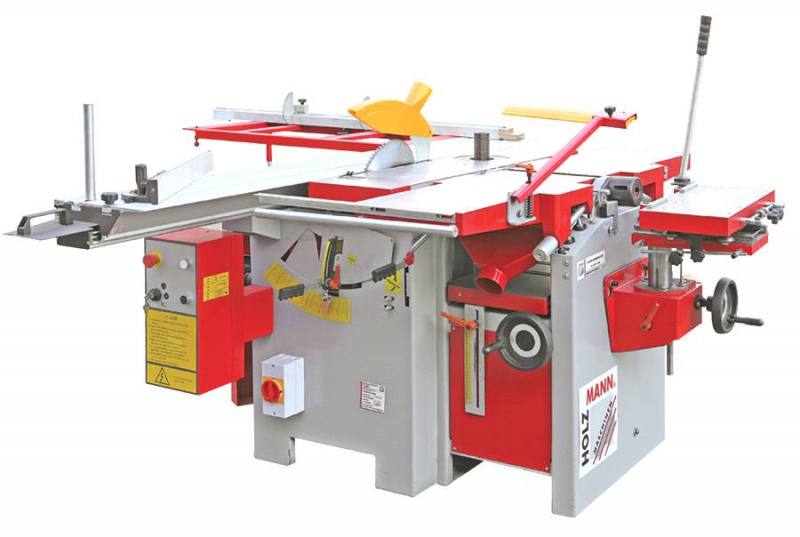 included in delivery: spindle shaper hood, mortising unit, 2m alu sliding table, planer knives, T.C.T-saw blades, mitre fence, planer fence