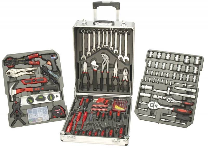 | 10 combination wrench (8-19mm), 8"long nose pliers, 7"cutting pliers, 9,5"groovejoint pliers, 8"adjustable wrench, 6"slip loint pliers, knife, tape measure 2 clamp, 9"torpedo level, 60 assorted fastener set, 80Z claw hammer, 8" wire pliers, 7" locking pliers, 10Y elec.tape, glue gun, 14 srewdirver, electric tester, 24 bits, 9 hex key (8-30mm), 6 precision screwdriver, screwdriver ratchet, pick-up tool, Y bit, 58mm extension bar, 1/4" ratchet handle, 1/2" ratchet handle, 12 1/4"DR sockets, 17 1/2"DR sockets, 1/2"DR *5/8 spark socket, 1/2"DR *13/16 spark socket, 1/3"DR & 1/2"DR univ. joint, 1/2"DR *10" & 5" extension bar, 1/4"DR sliding bar, 1/4"DR *2" & 4" extension bar, spinner handle, flexible extension bar 1/4DR *150mm, aluminium case |